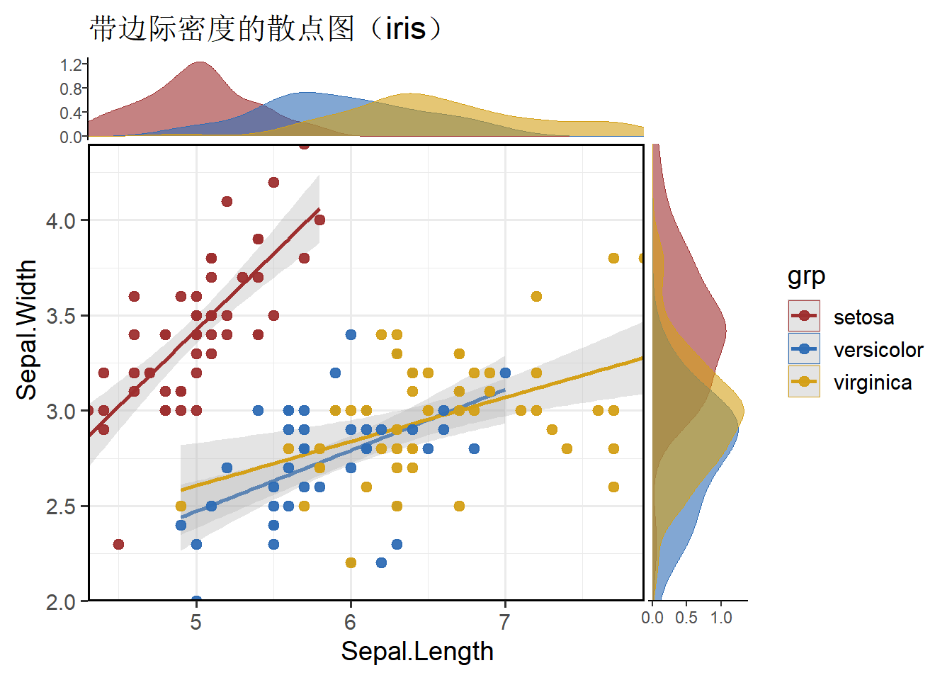 基于 iris 数据集,演示 ggside 的 geom_xsidedensity 与 geom_ysidedensity,在同一画面显示双变量关系与各自边际分布。