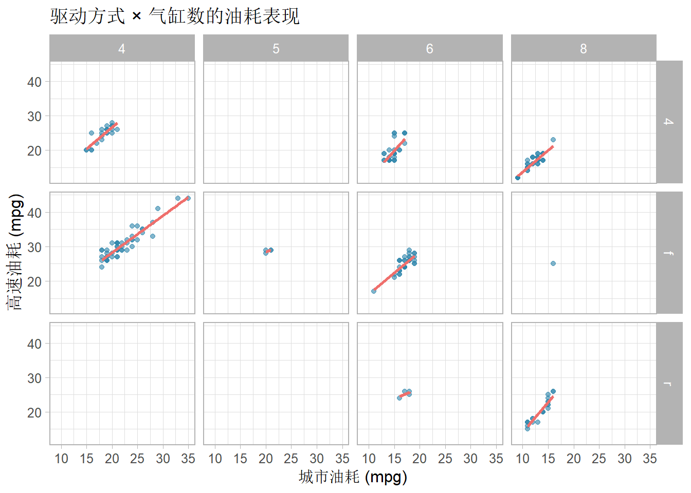facet_grid(rows = vars(drv), cols = vars(cyl)) +